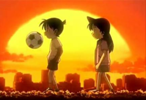 [[Fitxer:Shinichi i Ran. | [[Fitxer:Shinichi i Ran.png|thumb|En Shinichi i la Ran.]]En [[Shinichi Kudo]] i la Ran Mouri han estat amics des de la infància, es van conèixer en edat preescolar, i més tard van ser companys de jocs. Les seves mares, [[Eri Kisaki]] i [[Yukiko Kudo]], quedaven sovint perque els dos juguessin junts. En Shinichi i la Ran han estat propers fins a l'època actual, cosa que ha produït que els dos sentin sentiments romàntics per l'altre. La Ran recorda que va descobrir el que sentia realment per en Shinichi quan aquest la va rescatar d'un assassí en sèrie a Nova York, mentre que en Shinichi es va sentir cautivat pel somriure de la Ran quan es van fer amics a pre escolar. No obstant això, quan apareix en Conan i en Shinichi desapareix, ella es preocupa a si mateixa per la seguretat i el benestar d’en Shinichi, el qual, com a Conan, sovint la truca utilitzant la seva corbata de llacet per parlar-li amb la seva veu d’adolescent, sobretot per calmar-la quan té por per si està ferit, o quan la vol fer sentir millor perquè se sent sola sense ell. Com a Conan, és a prop de la Ran, la qual el cuida i el tracta com si fos el seu germà petit mentre es mostra dedicada a en Shinichi, al que estima sense importar-li on és. Per la seva banda, en Shinichi també té forts sentiments per la Ran, i hi està enamorat. Raó per la que és molt sobre protector d’ella quan hi ha altres nois a prop, i la manté allunyada de qualsevol perill. | ||