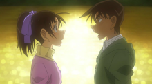 '''Kazuha Toyama. '''Igual que la relació entre en Shinichi i la Ran, en Heiji i la Kazuha són amics des de la infantesa i s'han mantingut propers al llarg dels anys. L'amor entre els dos personatges es fa cada cop més evident a mesura que va avançant la sèrie fins el punt que s'arriba a fer explícit quan en Heiji diu que vol confessar-li els seus sentiments. Concretament, quan en Heiji acompanya en Shinichi en el seu viatge escolar i veu el petó que li fa la Ran, ell pensa que s'està quedant sense llocs on confessar-se a la Kazuha. De fet, tot i que ho ha intentat en diverses ocasions, encara no ha estat capaç de dir-li què sent per ella. A més, s'ha demostrat que es posa notablement gelós quan la Kazuha es troba amb altres nois, cosa que fa que es distregui del cas que investiga. En un cas, quan creu que intenten fer mal a la Kazuha (tot i que en realitat es tractava d'un policia), en Heiji s'interposa cridant: "Què li fas a la meva Kazuha!?". Ara bé, quan la Kazuha li pregunta més tard per les seves paraules, ell diu que està equivocada i que no hi havia cap prova que demostrés que ell havia dit això (tot i que en Shinichi ho va gravar i l'Ai Haibara ho té com a so de trucada). D'altra banda, la Kazuha també té sentiments pel Heiji, i ho demostra intentant protegir-lo i enfrontant-se a altres noies que puguin tenir interès per ell. A més, la Kazuha li intenta confessar els seus sentiments després de descobrir que en Shinichi ho havia fet amb la Ran, però té la mala sort que, just abans de dir-ho, en Heiji fuig per obligar a en Conan a explicar-li com es va declarar a la Ran. En una ocasió, fins i tot va intentar sacrificar-se per salvar en Heiji en un cas en què els dos van caure d'un penya-segat. | |||